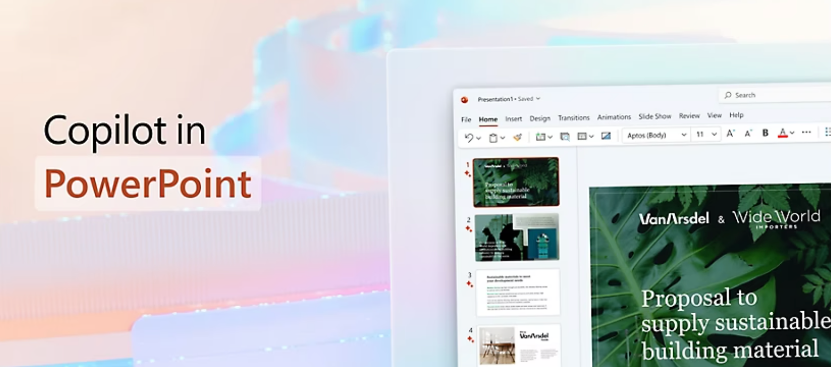 PowerPoint中的Copilot会将现有的Word文档转换为演示文稿,根据简单的提示或大纲创建新演示文稿,或找到适合具有冲击力的图像的最佳位置,并帮助你以熟练的故事讲述技巧给观众留下深刻印象。